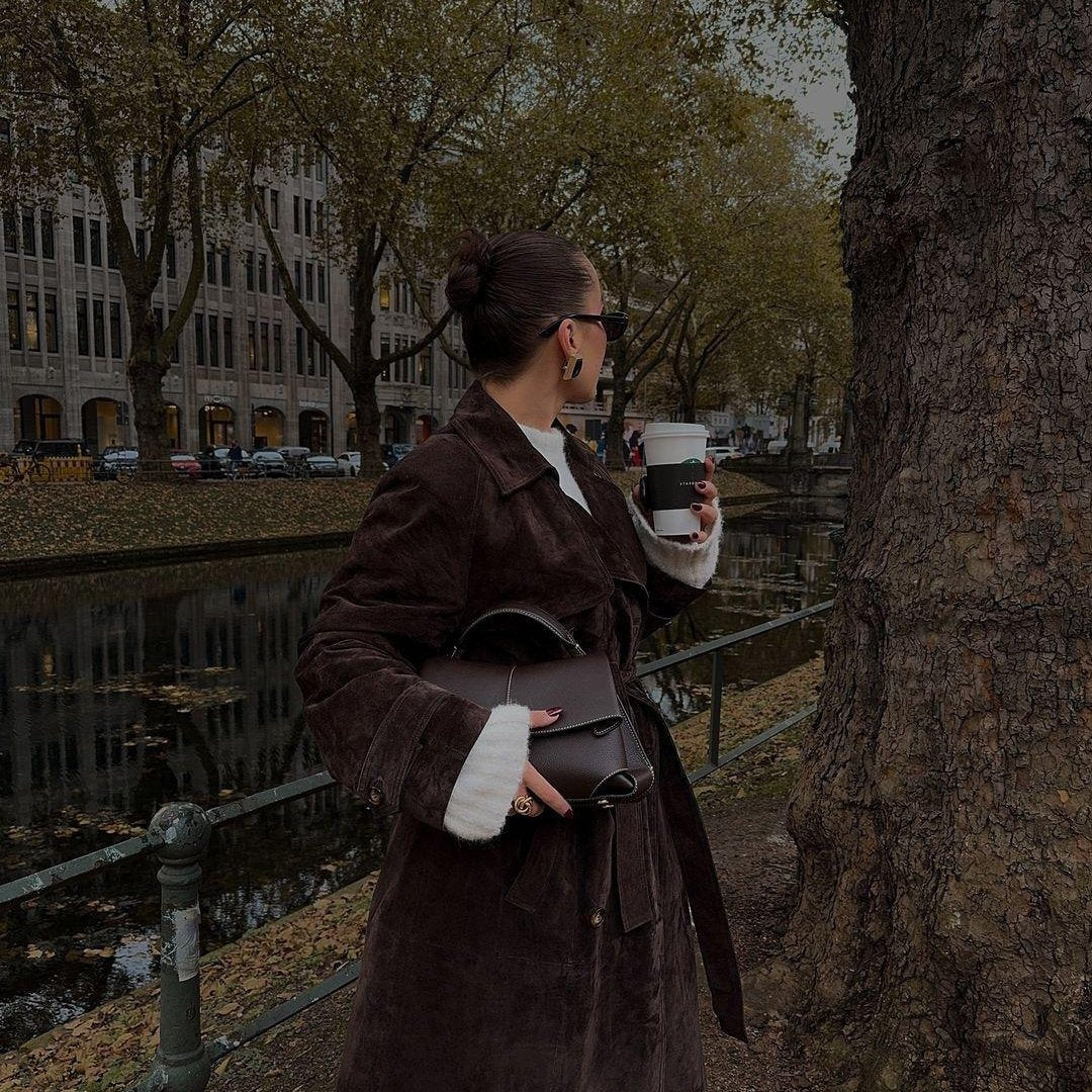 This structured silhouette features a folded front flap and a curved top handle for clean, sculptural lines. A concealed closure keeps the profile sleek, while angled side panels add shape.
